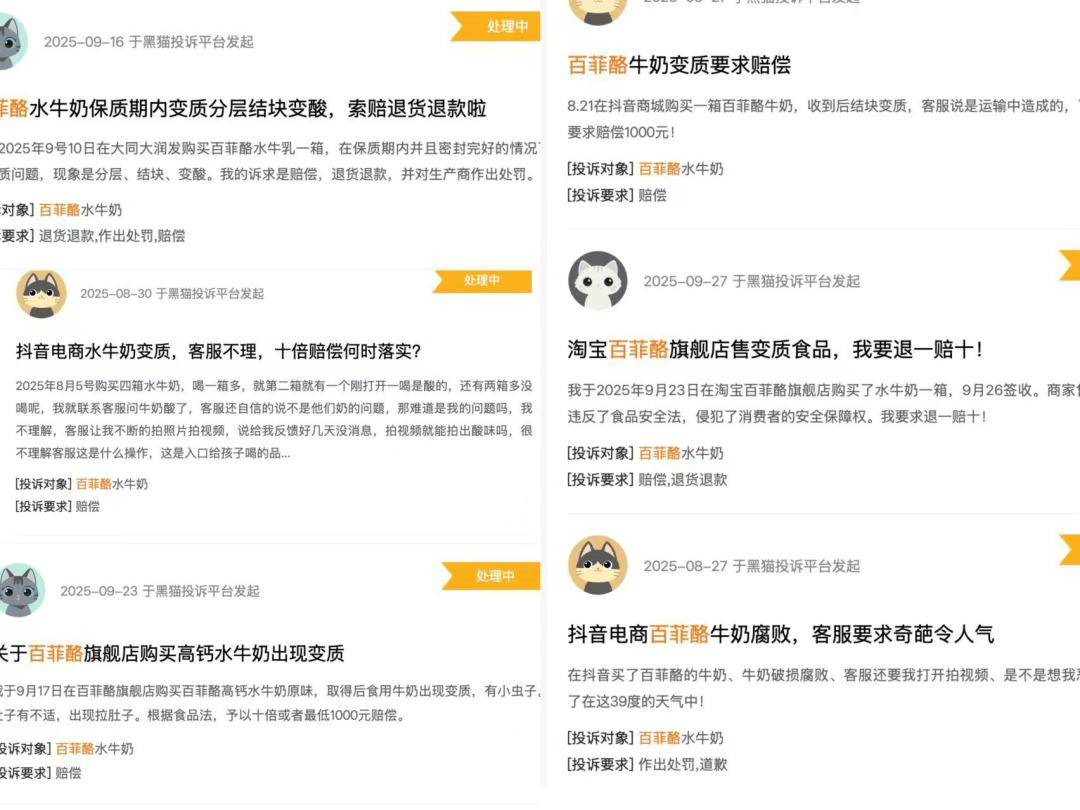 脆弱的供应链直接导致百菲乳业水牛奶质量问题频发,在黑猫投诉平台上,出现200多条关于奶质量问题的消费者投诉。不少消费者投诉称,百菲酪水牛奶在保质期内就出现结块、变质、酸味现象,甚至还有儿童饮用后出现腹泻、发热等不适症状。