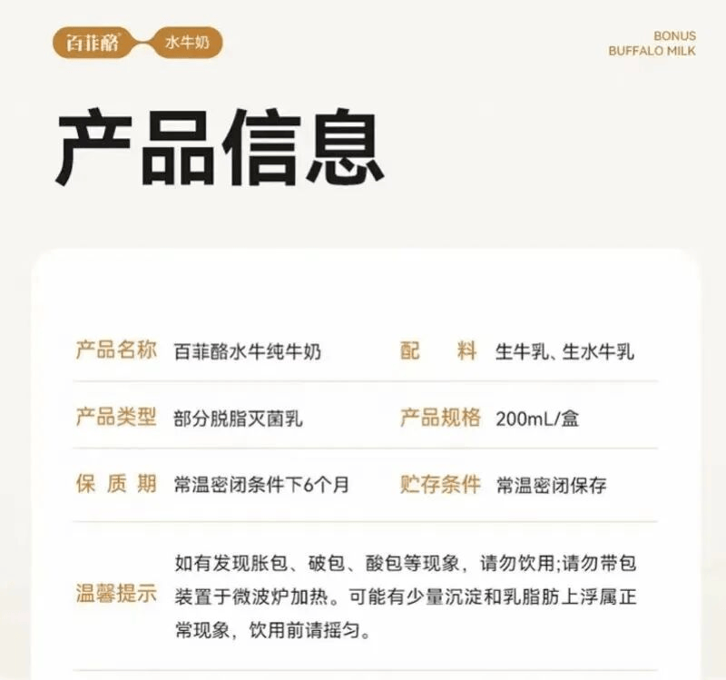 目前,国内尚未出台专门的水牛奶国家标准,产品多参照《GB 25190-2010 灭菌乳》等通用标准执行,这给了企业“打擦边球”的空间。不少产品以“水牛乳饮品”之名上市,但水牛乳实际含量不足50%甚至更少,也不未标注具体含量,却利用消费者“认知盲区”高价销售。