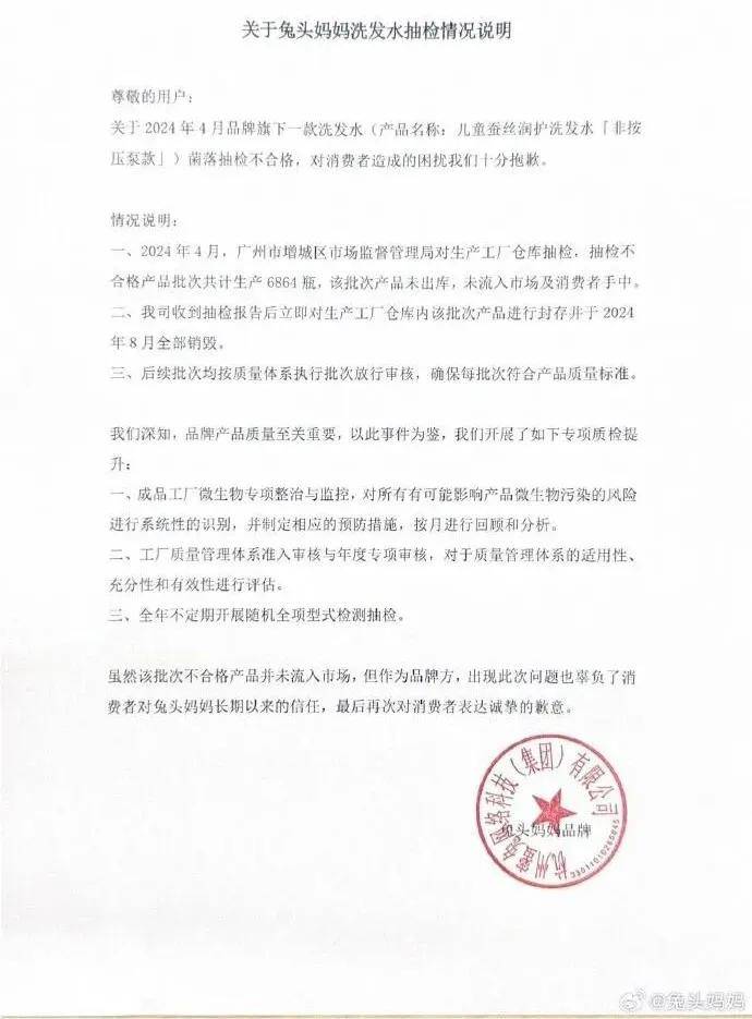 面对舆论质疑,「兔头妈妈」在社交平台发布致歉声明,表示涉事批次产品共计生产6864瓶,未出库流入市场,公司收到抽检报告后已对该批次产品封存,并于2024年8月全部销毁,并同时承诺,后续批次均按质量体系执行批次放行审核,确保符合质量标准。