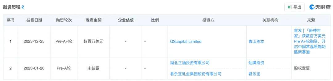 公开资料显示,酪神世家成立于2022年,由前光明乳业总经理郭本恒创立。凭借郭本恒在乳业领域多年积累的行业资源与影响力,这家初创企业自诞生起就自带“光环”。2023年的这一年里,酪神世家先后完成两轮融资,拿到超过百万美元的投资款,而且投资方的来头均不小,包括君乐宝、劲牌投资和青山资本。