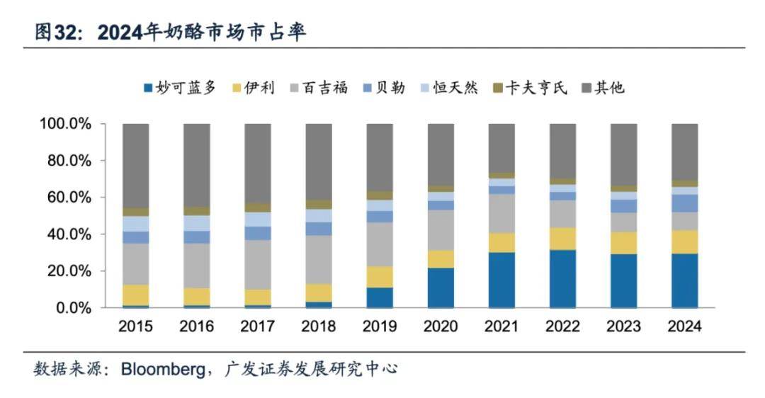 除此之外,中国奶酪行业“马太效应”日益凸显。2015-2024年,CR3和CR5均提升约15个百分点,行业加速向头部企业集中²。其中,A股上市公司妙可蓝多在渠道布局和品牌认知上已建立起优势。根据Worldpanel消费者指数,在2025年上半年中国包装奶酪品牌销售额中,妙可蓝多奶酪市场占有率超过38%。而伊利、百吉福、贝勒、恒天然、卡夫亨氏等也分别占有一定的份额。