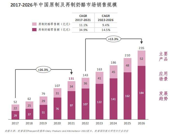 事实上,近年来整个奶酪行业都在经历“降温”。据欧睿国际数据,2017年-2021年我国原制及再制奶酪市场销售规模快速增长,年复合增速为26.3%;2022年-2024年市场增速放缓,年复合增速为13.3%,2024年市场销售规模达186亿元。