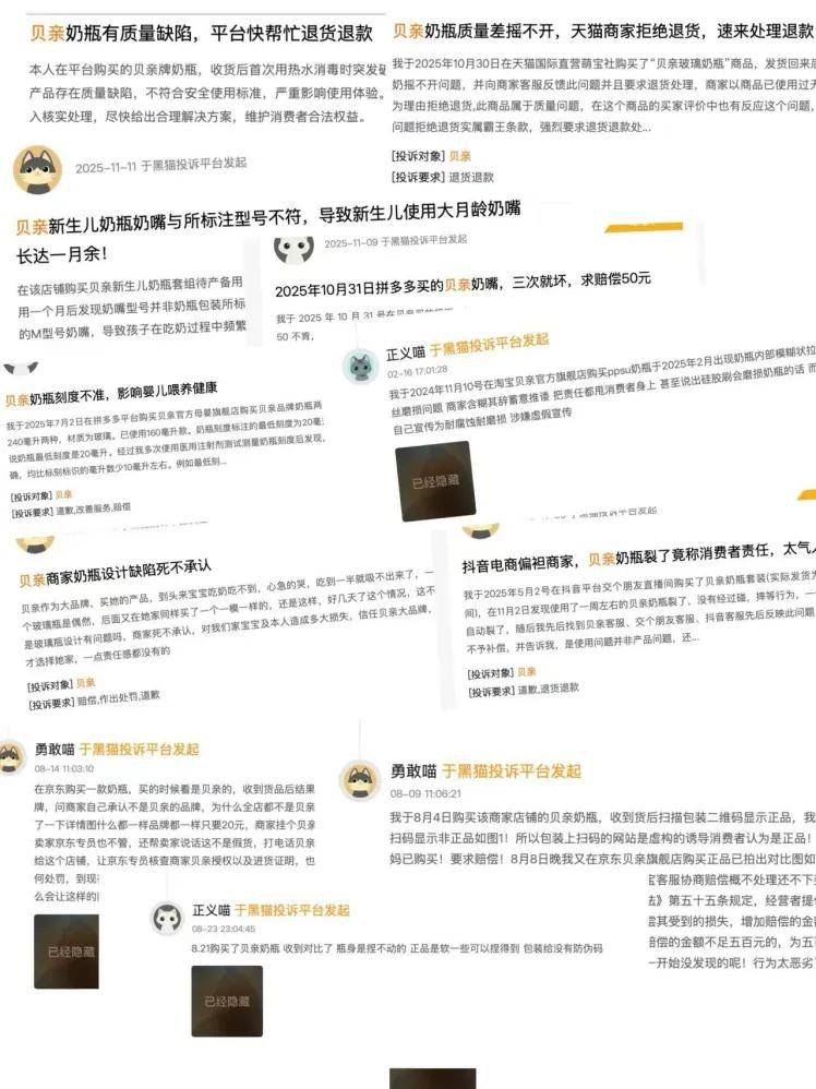 但在重金砸向营销后,另一大弊端愈发凸显。笔者在黑猫投诉平台检索后发现,关于贝亲(pigeon)的消费投诉高达1200+条,产品质量太差成消费投诉的重灾区。
