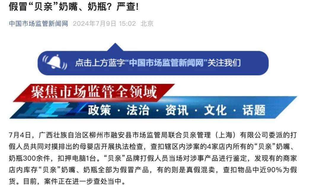 2024年,广西柳州市融安县市场监管局联合贝亲管理(上海)有限公司打假人员,对辖区4家母婴店执法检查后发现,超300个“贝亲”奶嘴奶瓶真假混卖,其中近90%为假货。
