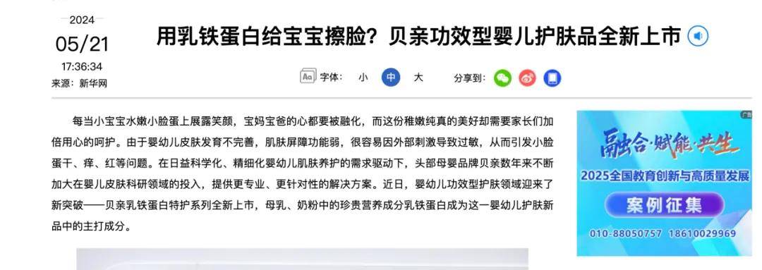 据悉,2024年,贝亲别出心裁的推出了乳铁蛋白特护系列护肤品,将一般出现在奶粉或营养品当中的乳铁蛋白,创新应用于婴童护肤品当中,宣称可以改善皮肤发红、干、痒、红、热等问题。