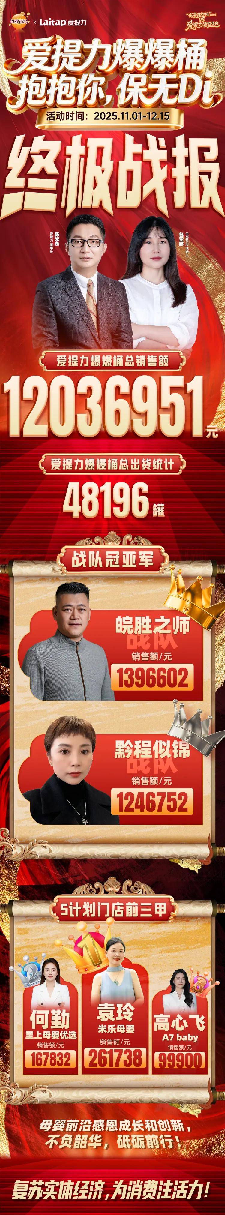 冠军战队安徽丰启商贸李健:我发现“爱提力爆爆桶”在修复老客户信心,加大终端情绪价值发挥了十分重要的作用,因为同时同步同品同频很重要。此外,控货是第一重要的,活动期间窜货得以控制是渠道信心恢复首要,只要再坚持4个月,爱提力一定会提振渠道信心,持续发力。