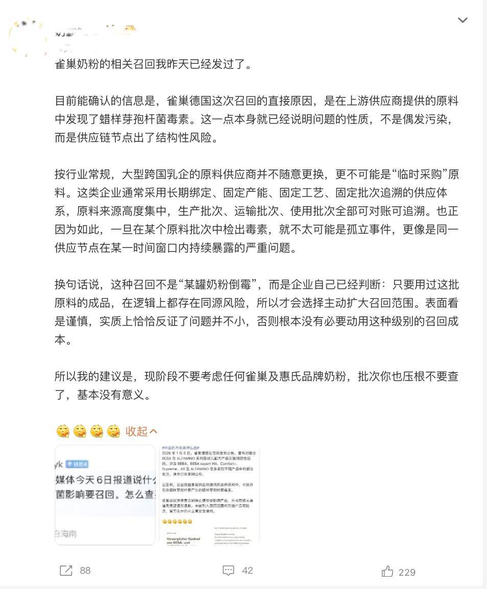 就此,有业内人士也公开指出:这种召回不是偶发污染,不是“某罐奶粉倒霉”,而是供应链节点出了结构性风险。只要用过这批原料的成品,在逻辑上都存在同源风险,所以品牌才会选择主动扩大召回范围。表面看是谨慎,实质上恰恰反证了问题并不小,否则根本没有必要动用这种级别的召回成本。
