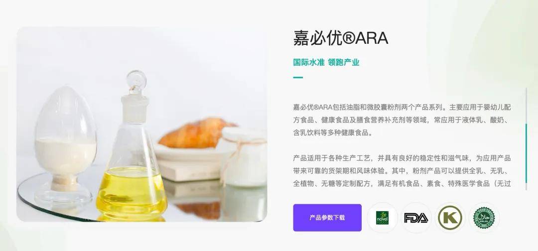 资料显示,嘉必优自称是目前国内最大的ARA产品供应商,已通过欧盟 Novel Food 和美国 FDA GRAS 的认证。旗下ARA产品包括油脂和微胶囊粉剂两大系列,主要应用于婴幼儿配方食品、健康食品及膳食营养补充剂等领域,常应用于液体乳、酸奶、含乳饮料等多种健康食品。