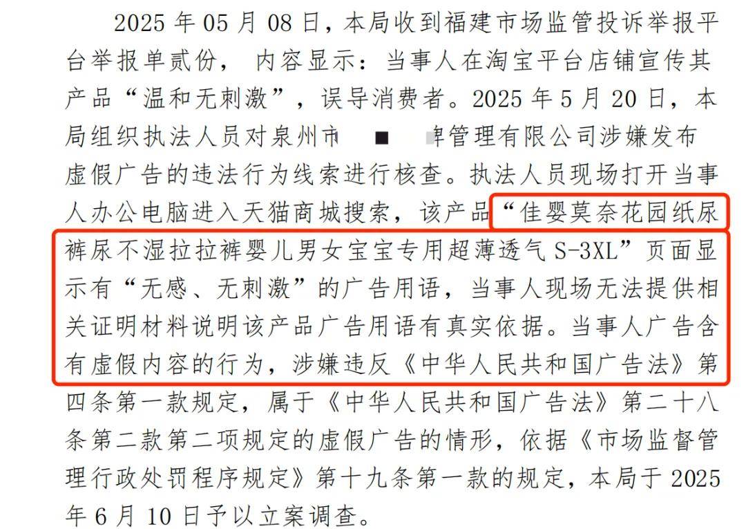 2025年5月,泉州市某品牌管理有限公司因在淘宝平台店铺,销售“佳婴莫奈花园纸尿裤尿不湿拉拉裤婴儿男女宝宝专用超薄透气 S-3XL”时宣称“无感、无刺激”的广告用语,被晋江市市场监督管理局行政处罚。原因是,该公司无法提供相关证明材料说明该产品广告用语有真实依据,因此被判定为广告含有虚假内容的行为。