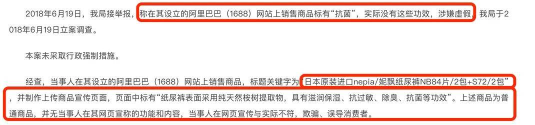 无独有偶,北京某商贸公司在阿里巴巴网站上销售“日本原装进口nepia/妮飘纸尿裤NB84片/2包+S72/2包”,并在宣传页面标有“纸尿裤表面采用纯天然桉树提取物,具有滋润保湿、抗过敏、除臭、抗菌等功效”。但经查发现,上述商品为普通商品,并无网页宣称的功能和内容,被判定为宣传与实际不符,欺骗、误导消费者。