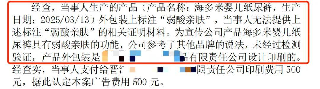 同年3月,福建某卫生用品有限公司生产的“海多米婴儿纸尿裤”,也因在包装上标注“弱酸亲肤”而被判定为虚假广告,并进行了行政处罚。因为该公司只是参考了其他品牌的说法,未经过检测验证,无法提供相关证明材料。