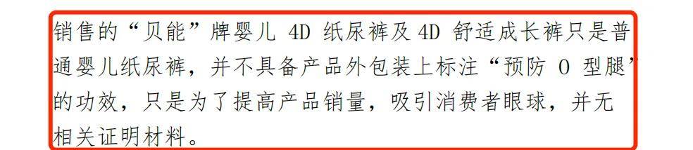 另外,荆门某贸易公司在旗下销售网点销售的“贝能”牌婴儿 4D 纸尿裤和“贝能”牌婴儿 4 D 舒适成长裤,产品外包装上标注“预防 O 型腿”的功效。但经查,以上产品均为普通婴儿纸尿裤,当事人只是为了提高产品销量,吸引消费者眼球,并无相关证明材料。