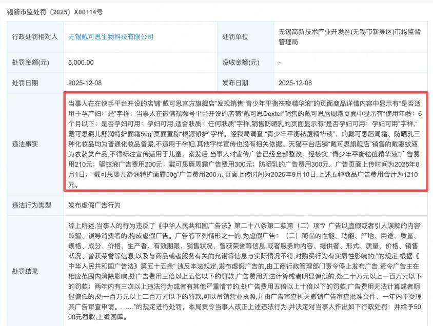 事实上,戴可思此次“食品级润唇膏”事件之所以能够引发轩然大波,关键原因在于其“前科”累累。就在此次立案调查的约一个月前,即2025年12月,该公司刚因“发布虚假广告”被同一辖区的市场监管部门处以5000元罚款并责令改正。