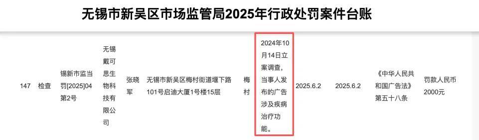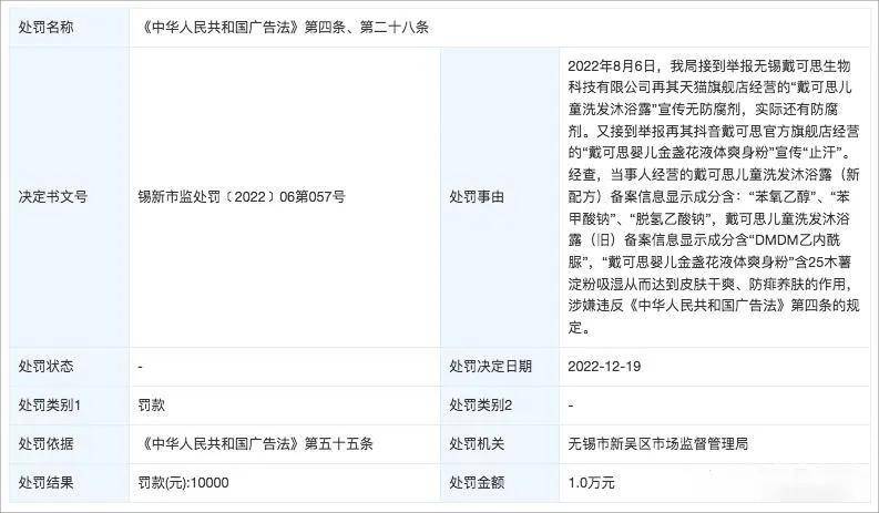 再往前追溯,2025年6月,戴可思还因发布的广告涉及疾病治疗功能,被行政处罚2000元。2024年,无锡戴可思生物科技有限公司被举报两次,且均被行政处罚;同年,安徽戴可思母婴用品有限公司因涉嫌发布虚假广告及发布违法广告,被行政处罚共计4000元。