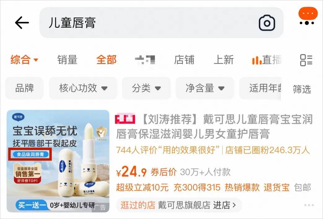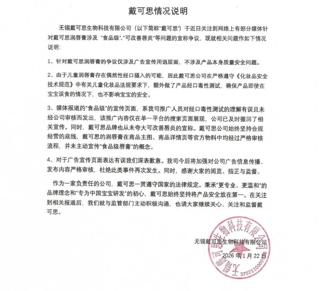 1月19日,知名母婴品牌“戴可思”被江苏省无锡市新吴区市场监督管理局梅村分局立案调查,事件迅速引发关注。起因是,在戴可思的官方旗舰店内,一款名为“婴儿护唇膏”的产品,在商品搜索结果界面被宣称是“食品级润唇膏”,并配以极具吸引力的标签“宝宝误舔无忧”。