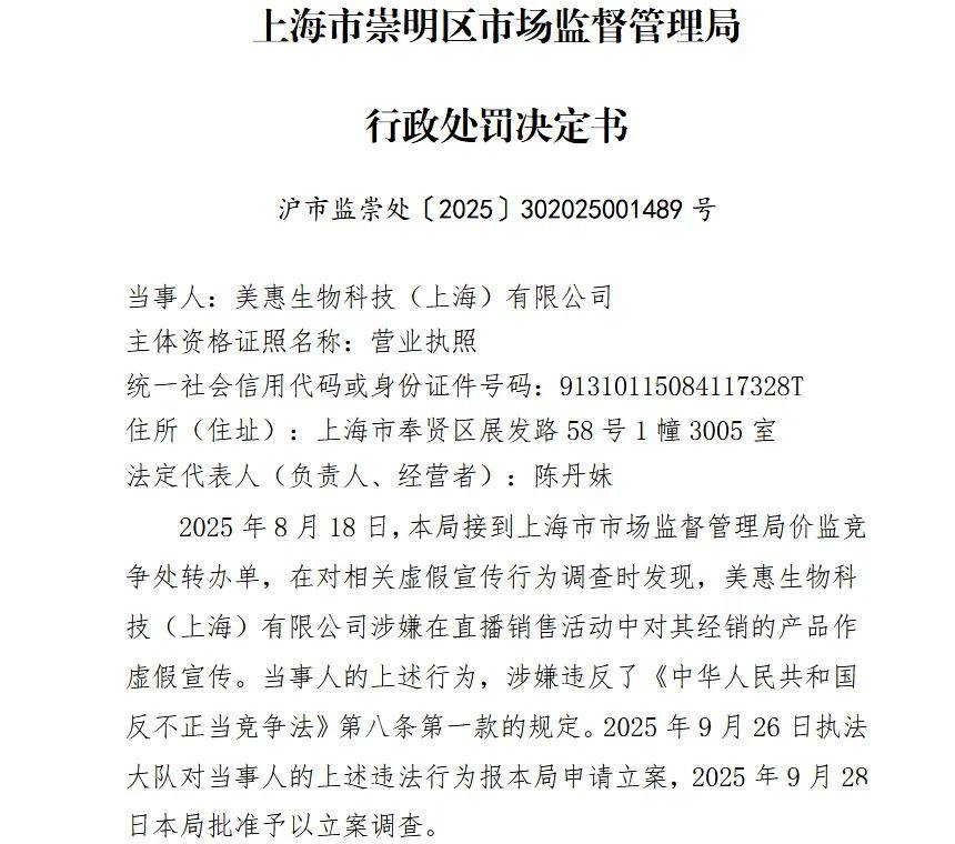 那菌小宝又是如何收割市场的?根据上海市崇明区市场监督管理局公布的行政处罚决定书,问题出在2025年6月18日的一次直播中。经销商美惠生物科技通过有赞平台的“菌小宝官方旗舰店”宣传“太空30号”产品时使用了不当措辞。