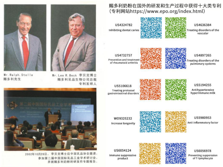 2002年,赐多利乳品生物公司总裁、专利发明人Lee. R. Beck李贝克博士应中国乳品协会邀请,参加第二届中国国际乳品工业学术研讨会,并就赐多利奶粉的研发做了专题报告。