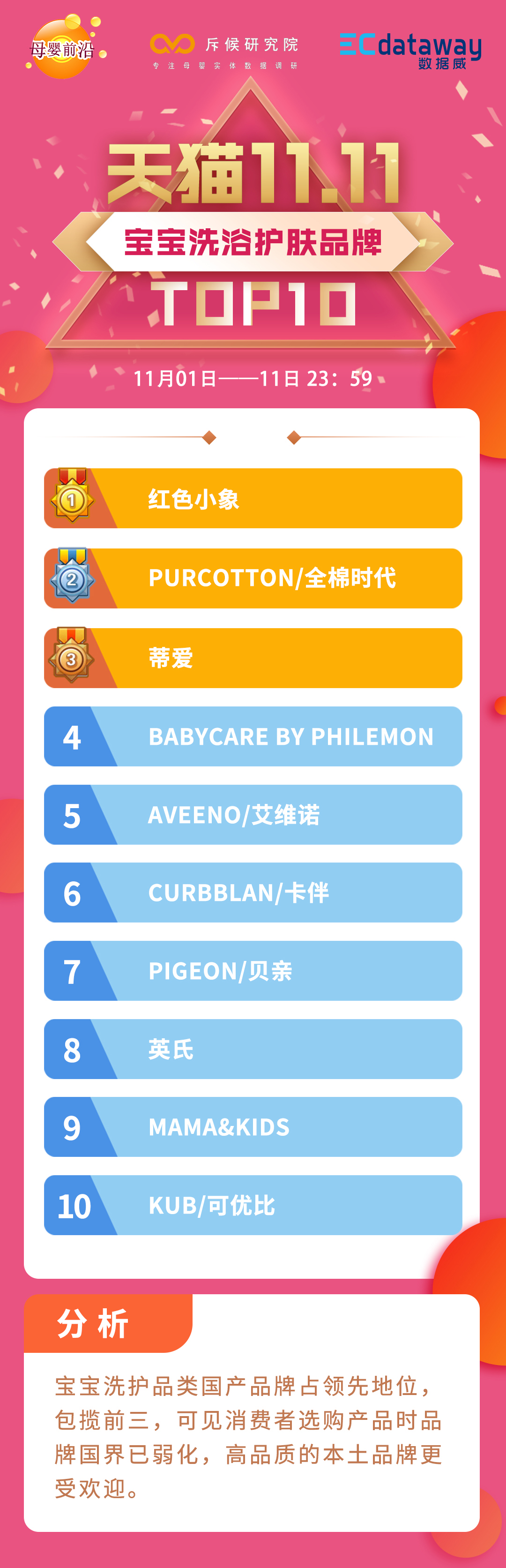 为助消费者更加明了聚焦母婴赛道下的品牌竞争形势,母婴前沿根据电商大数据服务商ECdataway数据威提供的双11数据,特此对包括婴幼儿牛奶粉纸尿裤、婴幼儿牛奶粉、孕产妇洗护、婴幼儿营养品、婴童床上用品等在内的16个细分品类top10进行了整合梳理并做了一个简单分析,具体如下: