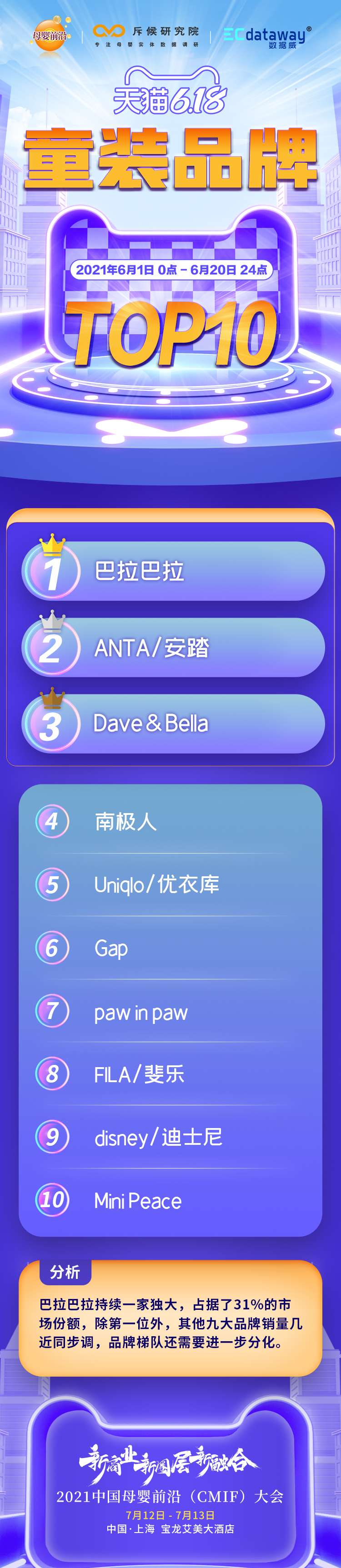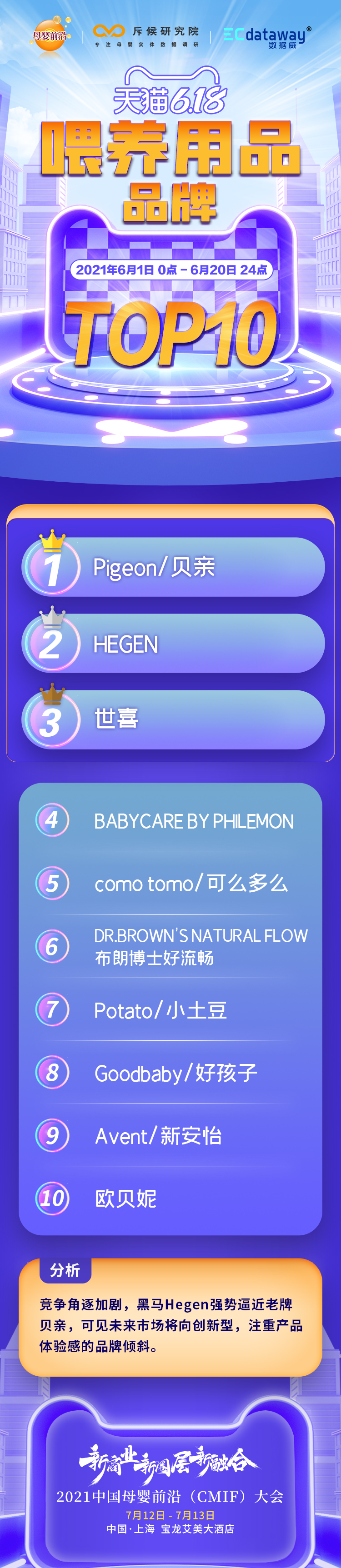 自6月1日0时至6月20日24时,持续将近三个星期的天猫618大促活动正式收官。为了让大众看清母婴赛道下的品牌竞争形势,母婴前沿根据电商大数据服务商ECdataway数据威提供的6·18数据,对婴幼儿牛/羊奶粉、婴幼儿营养品、孕产妇用品、驱蚊产品、喂养用品、零/辅食等在内的22个细分赛道上的品牌top10进行了整合梳理并做了一个简单分析,具体如下: